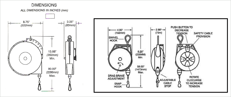 Reachet Type Series A feature rugged steel construction with a baked - on powder coat finish, reinforced hanging bracket with safety hook for ceiling mounting and extra holes for optional safety chain attachment. Spring is permanently lubricated and provides constant tension, adjustable for balancing tool in normal working zone, 6-8 in. (152_457mm). Cable is 920 lb. (414kg) test 0.09” (2,3mm) dia 7 *7 strand galvanized steel aircraft cable nylon covered to 0.12” (3,0mm) O.D Includes safety tool clip #261241 and adjustable cable stop.